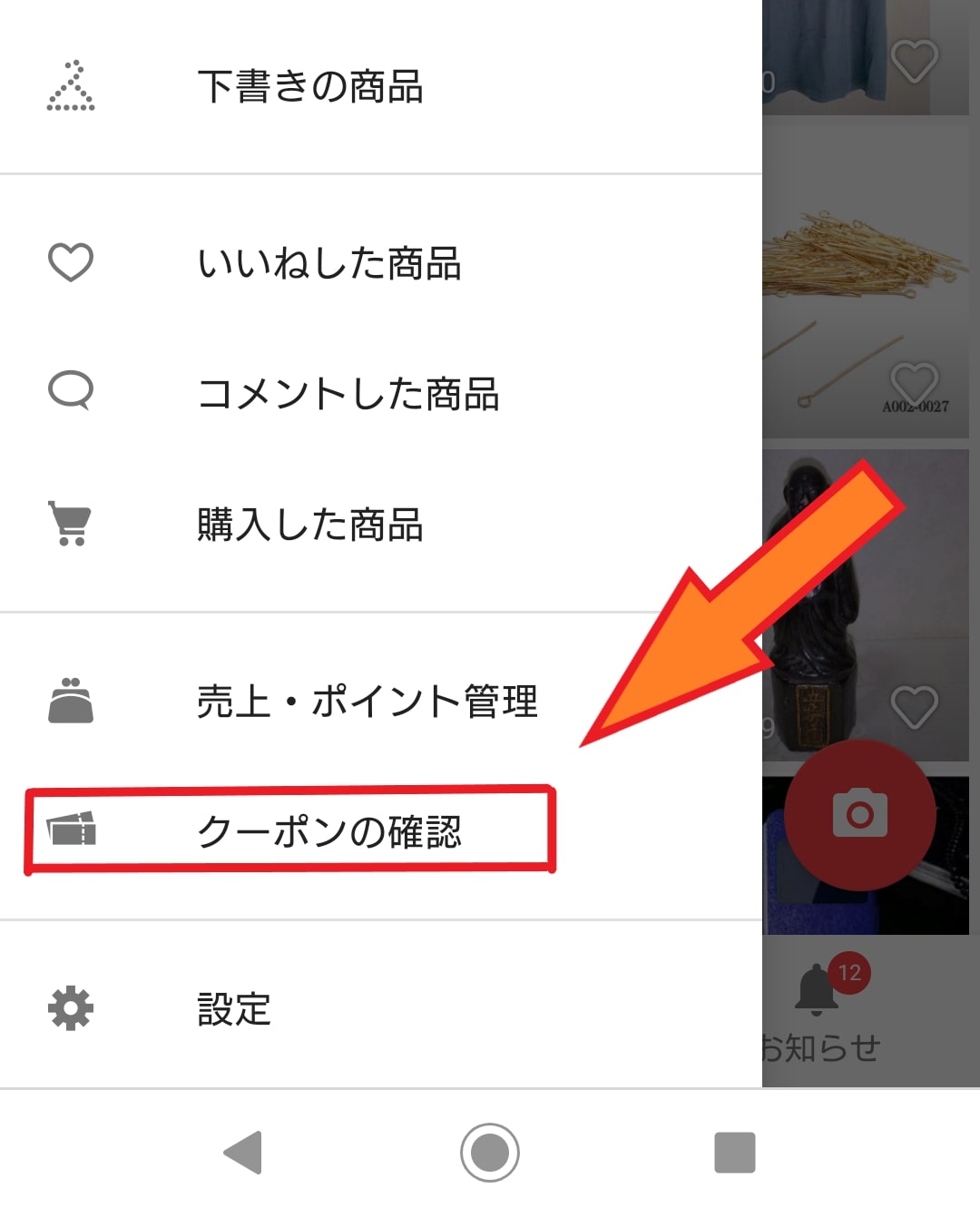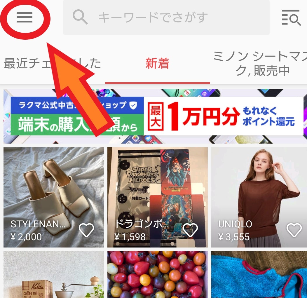 商品を購入する前に、自分がどんなクーポンをもっているのか確認しておきましょう。トップページの左上にある、三本線をタップ。